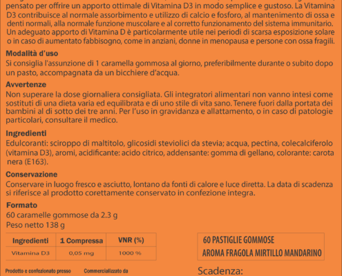 Formulato per supportare il benessere generale dell’organismo. La Vitamina D3 è essenziale per l’assorbimento del calcio e del fosforo, contribuendo al mantenimento di ossa e denti sani, nonché al corretto funzionamento del sistema immunitario.